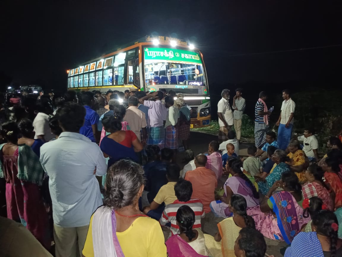 அந்த சமயம் பேருந்து சக்கரத்தில் உள்ள காற்றை இறக்க முயன்றதாக கூறி ஒருவரை கைது செய்ய முயன்றனர். அவரை விடுவிக்க கோரிய மக்களுக்கும், காவல் துறையினர் மற்றும் வருவாய் துறையினர்க்கும்
