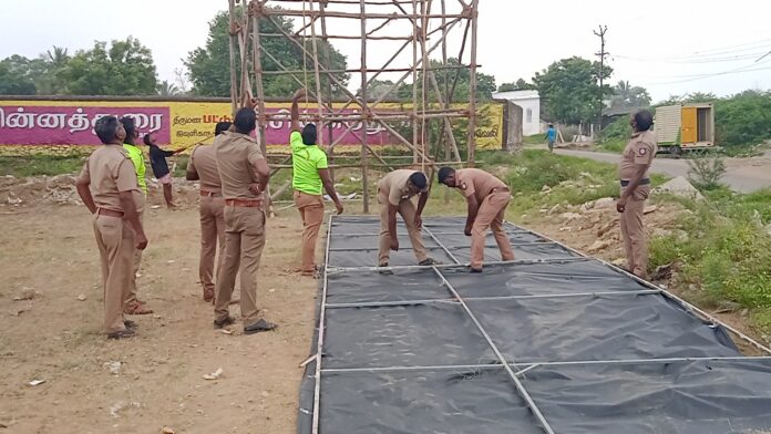இந்த நிலையில் அப்பகுதியில் வைக்கப்பட்டிருந்த பேனர் ஆனது காவல்துறை அனுமதியின்றி வைக்கப்பட்டதாக கூறி சாத்தான்குளம் போலீசார் மற்றும் சாத்தான்குளம் தீயணைப்பு நிலைய அதிகாரிகள் 10-க்கும் மேற்பட்டோர் திரையரங்கின் அருகே வந்து அங்கு வைக்கப்பட்டிருந்த 60 அடி உயர பேனரை கயிறு மூலம் கட்டி கீழே இறக்கினர்.