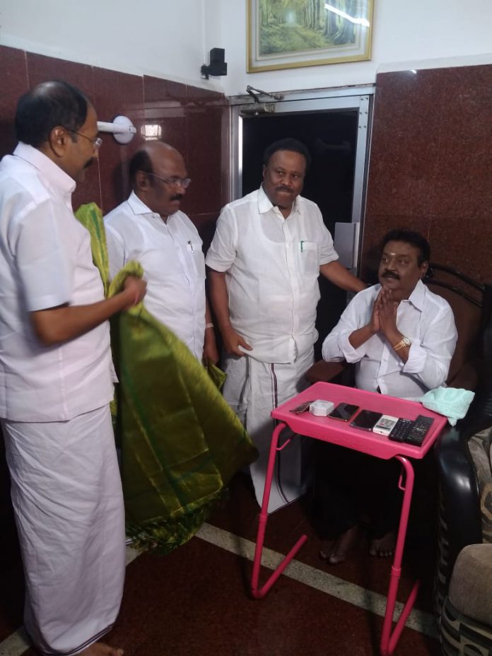 அரசியல் ஆதரவு கேட்டு விஜயகாந்துடன் அமைச்சர்கள் சந்திப்பு By Thennadu - 25th September 2019 0 562 Share on Facebook Tweet on Twitter நாங்குநேரி, விக்கிரவாண்டி தொகுதி இடைத்தேர்தலில் ஆதரவு கேட்டு தேமுதிக பொதுச்செயலாளர் விஜயகாந்தை அமைச்சர்கள் ஜெயக்குமார், தங்கமணி , திண்டுக்கல் சீனிவாசன் ஆகியோர் இன்று இரவு சந்தித்துப் பேசினர்.