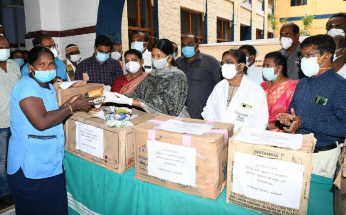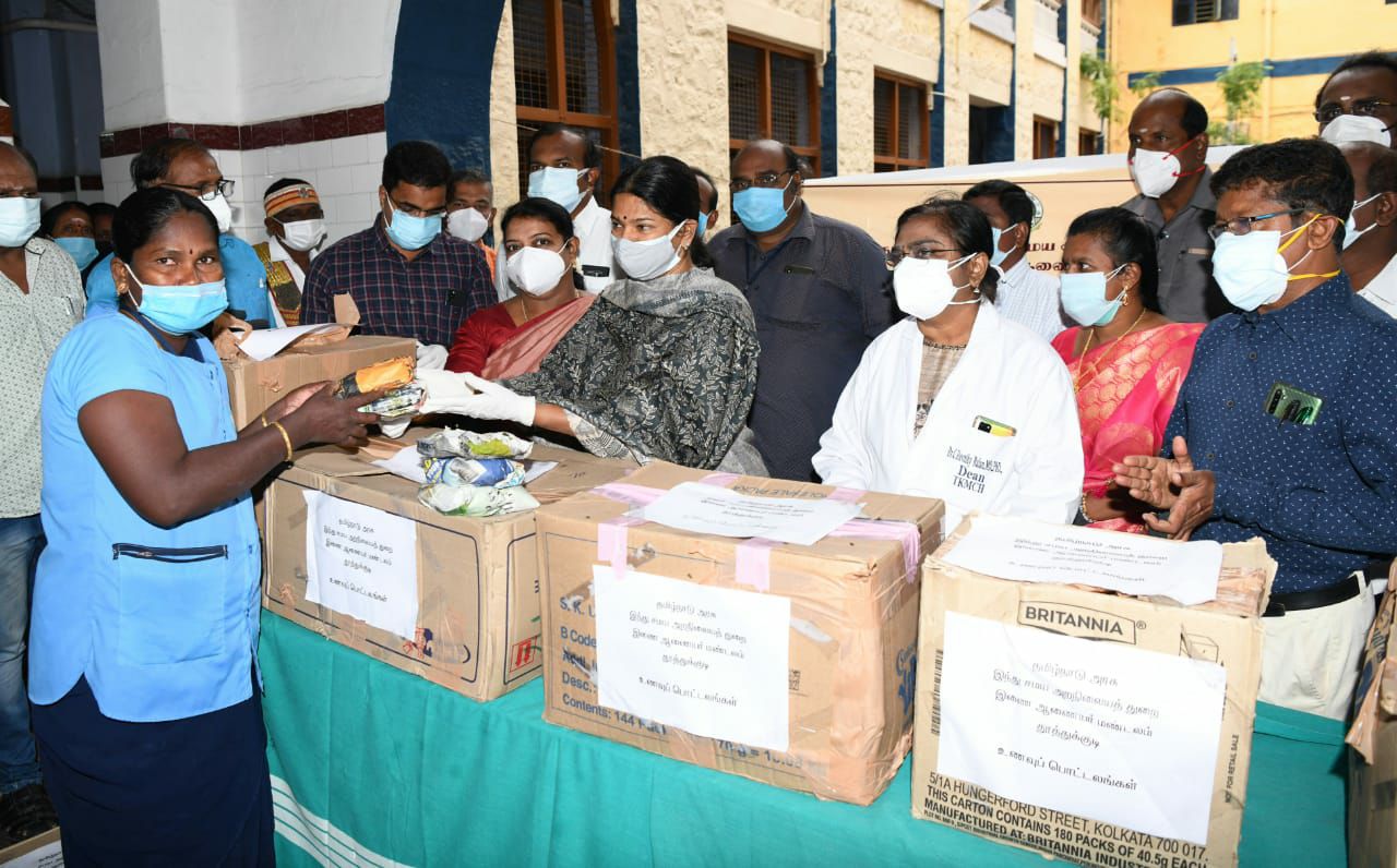 தூத்துக்குடி அரசு மருத்துவக் கல்லூரி மருத்துவமனையில் இந்து சமய அறநிலையத்துறை சார்பில் முன் களப்பணியாளர்கள் மற்றும் கொரோனா நோயாளிகளுக்கு உணவு பொட்டலங்கள் வழங்கும் நிகழ்ச்சி நடைபெற்றது. கனிமொழி எம்பி, சமூக நலத்துறை அமைச்சர் கீதா ஜீவன் ஆகியோர் கலந்துகொண்டு உணவு பொட்டலங்களை வழங்கினர்.