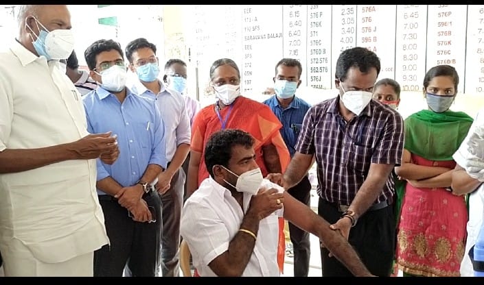 நெல்லை மாவட்டம் திசையன்விளை பேரூராட்சிக்குட்பட்ட பெருந்தலைவர் காமராஜர் பேருந்து நிலையத்தில் 18 வயதுக்கு மேற்பட்டவர்களுக்கான கொரோனா தடுப்பூசி முகாம் நடைபெற்றது. தமிழக சட்ட மன்ற சபாநாயகர் அப்பாவு , நெல்லை மாவட்ட ஆட்சித்தலைவர் விஷ்ணு , உதவி ஆட்சித் தலைவர் பிரதிக் தயாள் ஆகியோர் கலந்துகொண்டு தடுப்பூசி முகாமை தொடங்கி வைத்தனர். பின்னர் பேருந்து நிலையத்தில் கிருமிநாசினி தெளிப்பதற்காக தயார் நிலையில் நிறுத்தி வைக்கப்பட்டிருந்த தீயணைப்பு மற்றும் மீட்பு பணிகள் துறையின் வாகனத்தை சபாநாயகர் கொடியசைத்து இயக்கிவைத்தார்.