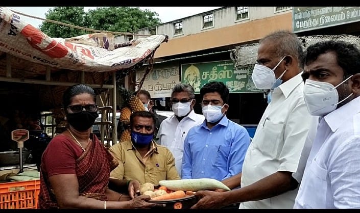 திசையன்விளை பேரூராட்சி மூலம் குறைந்த விலையில் காய்கறிகள் விநியோகம் செய்வதற்கான நடமாடும் காய்கறி வண்டியில் இரு பெண்களுக்கு காய்கறிகளை வழங்கி விற்பனையை தொடக்கி வைத்தார்.