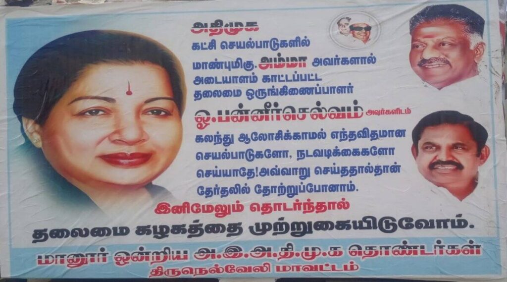 இதற்கிடையே திருநெல்வேலியில் ஓபிஎஸ்சை மதிக்கவேண்டும் என்று எச்சரித்து போஸ்டர்கள் ஒட்டப்பட்டன. வழக்கறிஞரான முக்கிய பிரமுகரின் ஆசியுடனேயே இந்த சுவரொட்டி கலகம் தொடங்கப்பட்டுள்ளதாக கமுக்கம் நிலவுகிறது. வழக்கம்போல் நெல்லை மண்டலத்திலிருந்து எதிர்ப்பு சலசலப்பு கிளம்புகிறது என்றாலும், பரவலாக ஓபிஎஸ் ஆதரவாளர்களுக்கு இந்த எண்ணமிருக்கிறது.