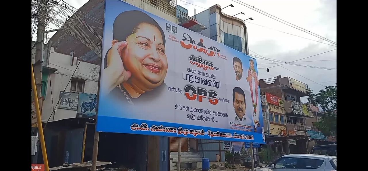 உங்கள் தலைமையில் அதிமுகவை வழிநடத்துவோம்!! என்று அச்சிடப்பட்டுள்ள அந்த பேனரில் முன்னாள் முதல்வர் ஜெயலலிதா, ஓ.பன்னீர்செல்வம் மற்றும் தேனி எம்.பி. ஓ.பி.ரவீந்திரநாத் ஆகியோரது புகைப்படங்கள் மட்டுமே இடம் பெற்றுள்ளன.